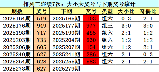 大小判断:上期排列三奖号为627,大小为:大小大,近7次大小为大小大的奖号为:519-949-717-735-605-627-628。