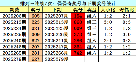 奇偶判断:上期排列三奖号为627,奇偶为:偶偶奇,近7次出现奇偶:偶偶奇奖号分别为:605-223-021-009-627-207-281。